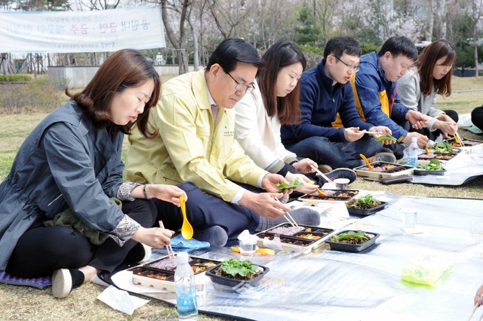 유덕열 서울 동대문구청장(왼쪽에서 두 번째)이 지난 8일 벚꽃이 핀 구민회관 앞 장평근린공원에서 최근 동대문구로 전입 온 직원들과 함께 점심 도시락을 먹고 있다. (사진제공=동대문구청)