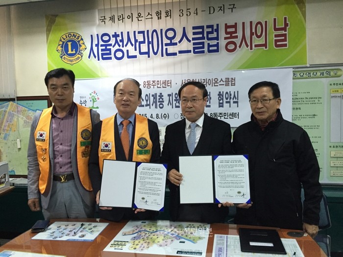 서울 중랑구 면목3·8동 주민센터가 지난 8일 동 주민센터에서 서울청산라이온스클럽과 경제적 소외계층 지원을 위한 협약을 체결했다. 사진은 이날 협약식에서 양측이 기념촬영한 모습. (사진제공=중랑구청)