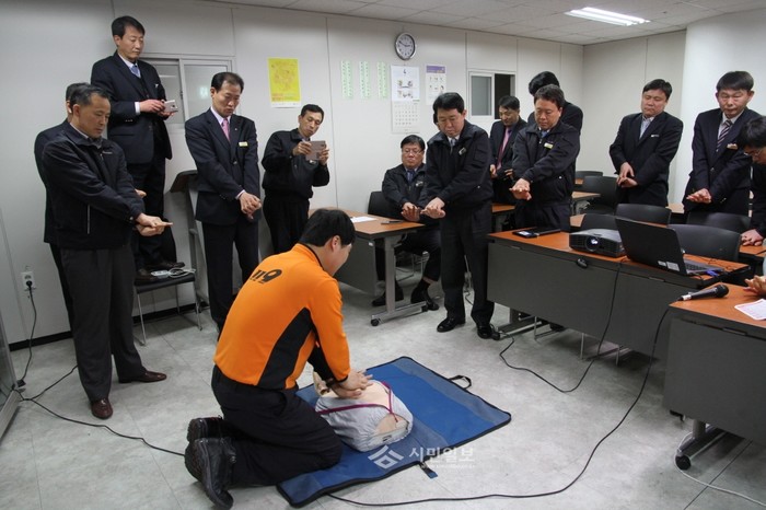 9일 서울 동작소방서는 오후 2시 동작동 서울메트로 동작승무사업소 역무원을 대상으로 소방안전교육을 실시했다. 사진은 이날 교육에서 소방관의 지도 아래 심폐소생술을 연습하는 역무원들의 모습. (사진제공=동작소방서)