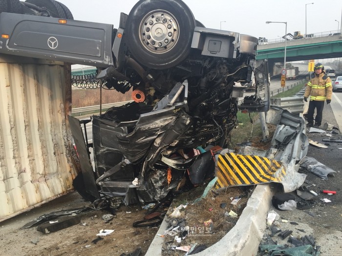 9일 경기 여주소방서 소방관들이 중부내륙고속도로 여주분기점 양평방면 고속도로에서 발생한 25톤 트레일러 차량 전복 교통사고 현장에서 유압장비를 활용, 요구조자 2명을 구조하고 있다. (사진제공=여주소방서)