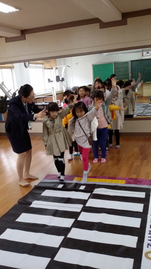경북 구미 형일초등학교는 지난 8일 1·2학년 학생들을 대상으로 교통안전교육을 실시했다. 사진은 이날 교육에 참여한 어린이들이 지도교사의 도움을 받아 횡단보도 안전하게 건너기 체험을 하고 있는 모습. (사진제공=구미교육청)