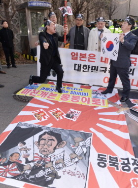 9일 오전 서울 성북구 성북동 일본 대사관저 앞에서 애국국민운동대연합 관계자들이 일본 정부 독도 영유권 주장 규탄 기자회견을 하고 있다.