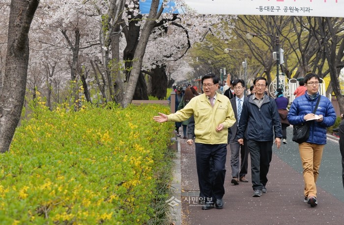 유덕열 서울 동대문구청장(왼쪽)이 지난 11일 열린 '동대문구민 한다음 걷기의 날' 행사를 앞두고 구 관계자들과 함께 행사점검의 일환으로 중랑천 장안 벚꽃로를 순찰하고 있다. (사진제공=동대문구청)