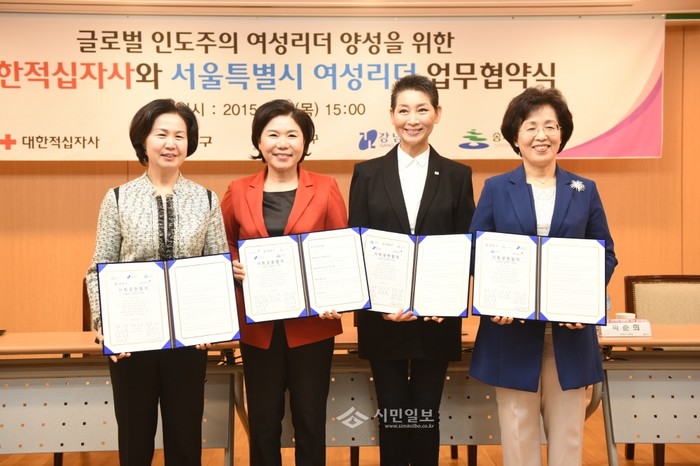 서울 양천구는 최근 대한적십자사 본사에서 대한적십자사와 ‘여성리더 양성을 위한 업무협약’을 체결했다. 사진은(왼쪽부터) 행사에 참석한 김수영 양천구청장, 조은희 서초구청장, 김성주 대한적십자사 총재, 박춘희 송파구청장의 모습. (사진제공=양천구청장)