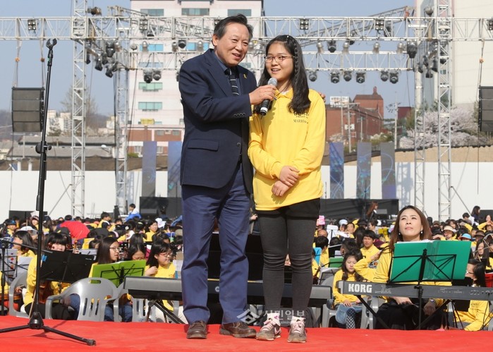 서울 금천구가 최근 구청사 뒤 특설행사장에서 '제11회 금천하모니 벚꽃축제'의 메인행사인 '제5회 금천하모니 2000인 오케스트라 대향연'을 성황리에 마쳤다. 사진은 금천하모니 오케스트라 시작 전, 차성수 금천구청장(왼쪽)과 오케스트라 대표 학생이 개막을 알리는 멘트를 하고 있는 모습. (사진제공=금천구청)