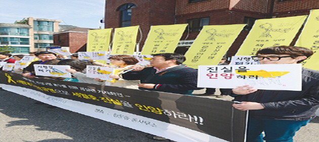 13일 오전 서울 종로구 청운동 주민센터 앞에서 열린 ‘세월호 참사 1년, 진상규명 촉구를 위한 기자회견’에서 경실련 권오인(오른쪽 두번째) 회원이 ‘정부시행령 폐기, 세월호 인양’을 촉구하는 발언을 하고 있다.