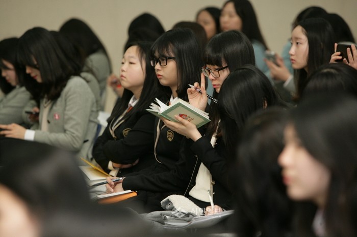 서울 성동구는 최근 구청 3층 대강당에서 특성화고 학생 800여명을 대상으로 취업컨설팅을 실시했다. 사진은 이날 강의에 참석한 학생들이 본인의 구직 분야에 맞춘 수업을 듣고 있는 모습. (사진제공=성동구청)