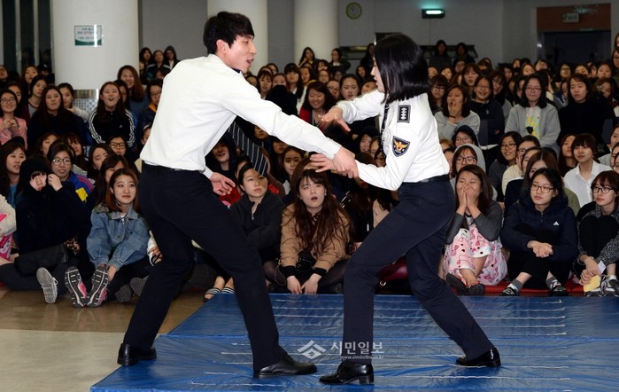 | ▲ 숙명여대가 지난해 서울 본교 기숙사인 명재관에서 사생보안과 안전교육을 실시한 가운데 학생들이 용산경찰서 여성보호계 무술 유단 경찰관들의 호신술 시범을 지켜보고 있다. /뉴시스 | ||