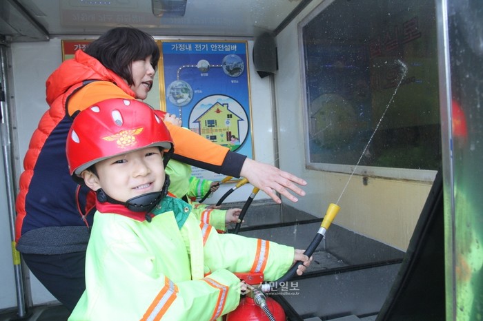 지난 13일 서울 동작소방서는 동작구 보라매공원에서 참사랑어린이집 등 원아들을 대상으로 '119안전체험차량 소방안전교육'을 실시했다. 사진은 체험차량 안에서 소화기를 이용한 화재진압법을 배우고 있는 아이들의 모습. (사진제공=동작소방서)