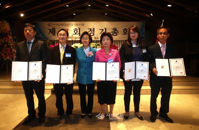 지난 13일 서울 강남구 한 웨딩홀에서 열린 ‘강남구 외식업협회 정기총회’에 참석한 신연희 강남구청장(왼쪽에서 세 번째)이 음식문화 개선에 힘써 온 협회원들에게 표창장 수여 후, 기념촬영을 하고 있다. (사진제공=강남구청)