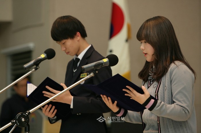 지난 13일 오후 4시 서울 성동구는 구청 대강당에서 주민, 학생, 각계대표 등 300여명이 참석한 가운데 세월호 사고 1주기를 추모하며 생명안전을 일깨우기 위한 '어린이ㆍ청소년 생명안전 보호를 위한 약속식'을 열었다. 사진은 어린이ㆍ청소년 대표로 나선 학생들이 생명안전 보호에 대한 희망편지는 낭독하는 모습. (사진제공=성동구청)
