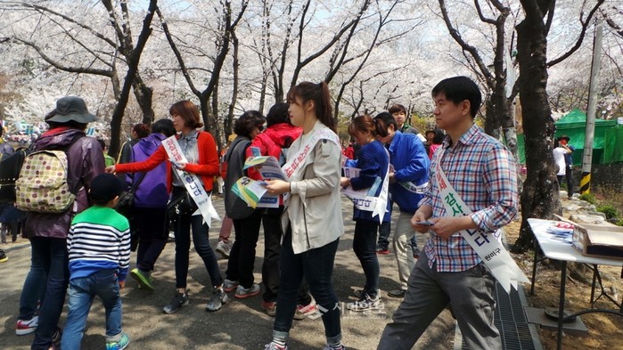 경기 부천시 원미구는 최근 원미산 진달래축제장과 도당산 벚꽃축제장을 찾은 시민들을 대상으로 '지방세 납세편의 시책 홍보 캠페인'을 전개했다. 사진은 이날 홍보에 참여한 직원들이 시민들에게 홍보물을 나눠주고 있는 모습.(사진제공=부천시청)