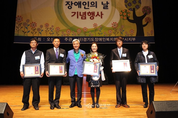 경기 오산시가 지난 14일 오산문화예술회관 대공연장에서 '제35회 장애인의 날' 기념행사를 가졌다. 사진은 행사에서 표창을 수여한 장애인 복지 유공자들과 곽상욱 오산시장(왼쪽에서 세 번째)이 기념촬영한 모습. (사진제공=오산시청)