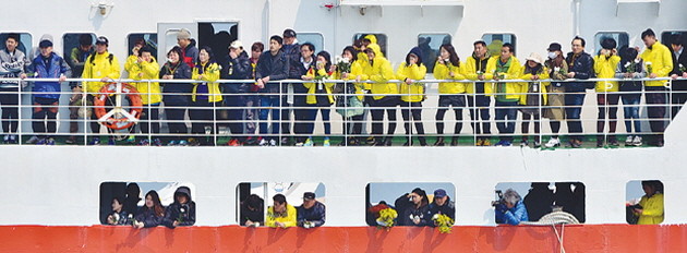 이들은 가슴에 꽃다발을 안고 착잡한 마음으로 철부선에 올라 사고해역으로 가는 1시간30여분 동안 세월호 참사와 관련된 현 상황 등을 이야기했다.