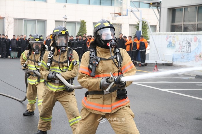 서울 은평소방서가 지난 15일 오전 본서 후정에서 '2015 소방기술 경연대회' 출정을 위한 시연회를 열었다. 사진은 이날 참여한 소방대원들이 '속도방수 화재진압 시연'을 하는 모습. (사진제공=은평소방서)