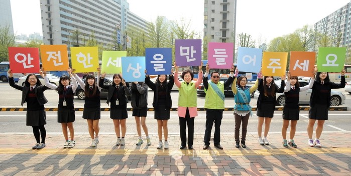 서울 송파구가 지난 15일 '제1회 국민안전의 날'을 맞아 잠실역 사거리에서 개최한 재난 예방 안전체험 및 안전문화 캠페인에 참석한 박춘희 송파구청장(오른쪽에서 다섯 번째)이 잠신고 학생들과 함께 카드섹션을 하고 있다. (사진제공=송파구청)
