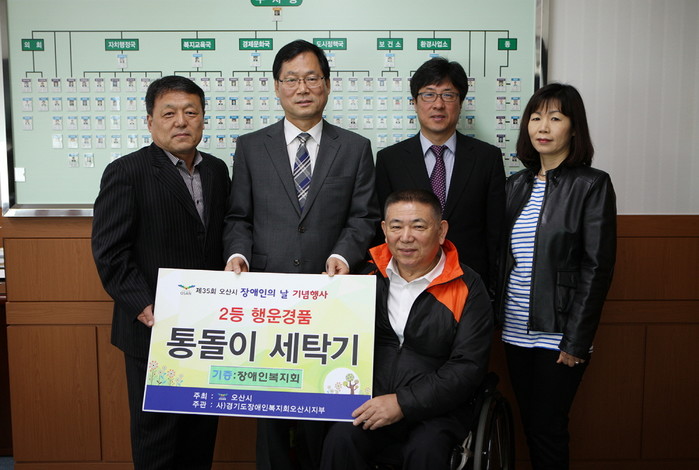 경기 오산시청 부시장 집무실에서 지난 15일 이웃돕기 성품 기탁식이 진행됐다. 이는 한 시민이 '제35회 장애인의 날 기념식'에서 경품으로 받은 세탁기를 다시 시에 재기탁해 마련된 것이다. 사진은 기탁식에서 이강석 부시장(왼쪽에서 두 번째)과 관계자들이 기념촬영한 모습. (사진제공=오산시청)