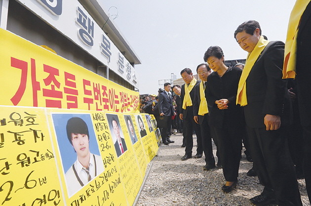 세월호 참사 1주기인 16일 박근혜 대통령이 전남 진도군 임회면 팽목항에서 분향소를 돌아보고 있다.