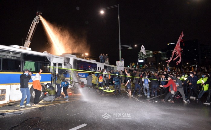 18일 오후 서울광장을 출발해 광화문으로 행진을 시도하는 세월호 1주기 범국민대회 참가자들이 경찰버스를 끌어당기자 경찰이 물대포를 살포하고 있다.