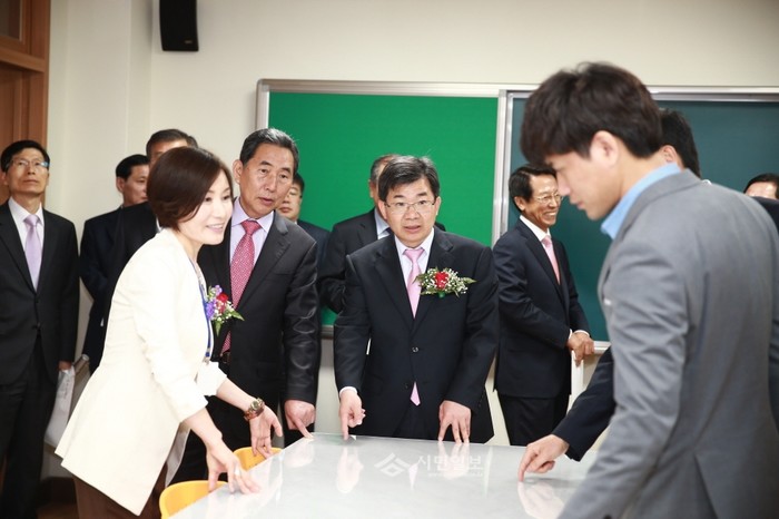 전남 여수웅천중학교가 지난 20일 관계자 및 학부모 200여명이 참석한 가운데 개교식을 진행했다. 사진은 이날 개교식에서 정병걸 전남교육청 부교육감(가운데)과 관계자들이 학교 시설을 살피고 있는 모습. (사진제공=전남교육청)