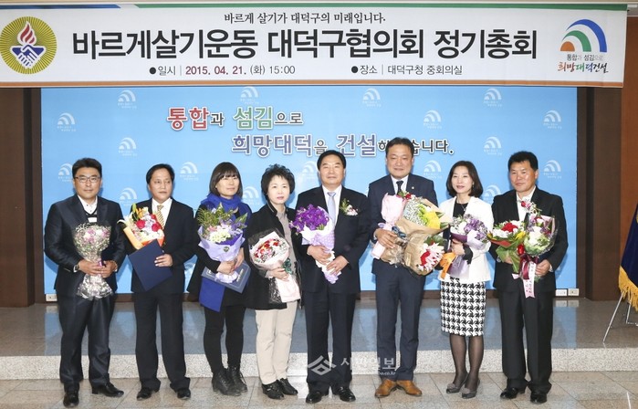 박수범 대전 대덕구청장(오른쪽에서 네 번째)이 지난 21일 구청 중회의실에서 열린 '2015바르게살기운동대덕구협의회 정기총회'에 참석해 그동안 진실·질서·화합의 기본이념을 몸소 실천한 한철수 부회장 외 14명에게 표창장을 수여했다.(사진제공=대덕구청)