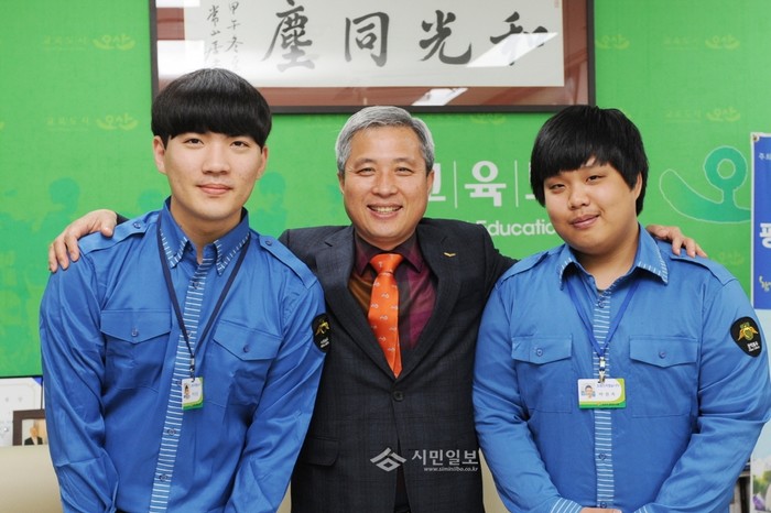 곽상욱 경기 오산시장이 지난 21일 자신의 집무실에서 위급한 생명을 구한 사회복무요원을 격려했다. 중앙도서관에서 근무하는 이들은 지난 16일 도서관에서 쓰러진 여성을 응급조치하고 119에 구조요청해 생명을 살렸다. (사진제공=오산시청)
