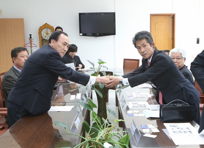 지난 21일 서울 성북구의회는 일본 구라시키 시의회 의장을 포함한 의원 6명의 방문을 받았다. 이번 방문은 성북구와 구라시키시가 2012년 유엔 해비타트(UN-HABITAT) 주관 '아시아 도시경관상'을 함께 받은 것을 인연으로 양 의회의 교류 협력 증진을 위해 진행됐다. 사진은 악수를 나누는 임태근 의장(왼쪽)의 모습.(사진제공=성북구의회)