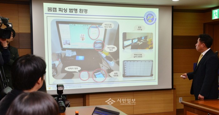 23일 오전 서울지방경찰청 어울림세미나실에서 김상국 경위가 1000명으로부터 10억 상당의 금품을 갈취한 몸캠 피싱 피의자 일당 검거 관련 브리핑을 하고 있다. 서울지방경찰청 사이버범죄수사대는 2014년 5월경부터 2015년 4월경까지 스마트폰 채팅앱에서 피해자를 유인, 전화번호, 문자메세지, 위치정보 등 탈취기능의 악성프로그램을 유포하고 모바일 영상 채팅을 통해 여성의 알몸 영상을 보여주면서 피해자에게 알몸채팅을 유도한 후 이를 촬영해 지인들에게 유포하겠다고 협박·공갈해 피해자 1,000명으로부터 10억원 상당의 재산상 이득을 취한 19명을 검거하고 이중 5명을 구속했다.