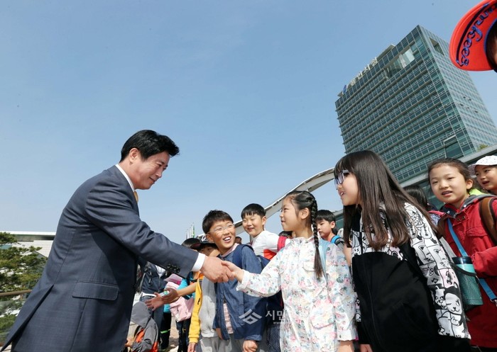 경기 용인시 처인구 서룡초등학교 학생들이 최근 용인시청사를 방문해 현장체험을 했다. 사진은 이날 시청사를 방문한 학생과 정찬민 용인시장(왼쪽)이 악수를 하는 모습. (사진제공=용인시청)