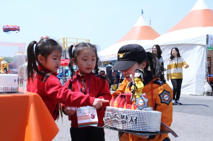 동작소방서는 지난 23일 영등포구 여의도 공원 문화의 마당에서 서울안전 체험한마당을 운영했다. 사진은 이날 체험한마당에 참여한 어린이들이 생일 케이크에 촛불을 끄며 소화의 원리를 배우고 있는 모습. (사진제공=동작소방서)