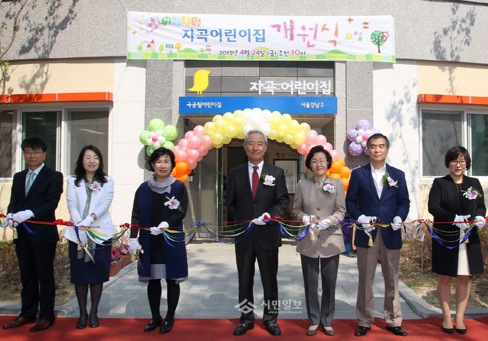 지난 24일 서울 강남구 자곡어린이집 개원식에 참여한 신연희 강남구청장(오른쪽에서 세 번째)이 김종훈 국회의원(오른쪽에서 네 번째), 김현기 서울시의원(오른쪽에서 두 번째), 내빈들과 함께 리본 커팅식을 하고 있다.