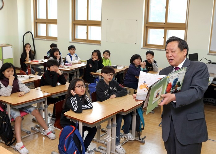 차성수 서울 금천구청장이 지난 24일 서울신흥초등학교에서 진행된 '와글와글 책읽는 소리, 신흥을 흔들다!'에 참석했다. 사진은 이날 행사에 참여한 차성수 구청장(오른쪽)이 학생들에게 직접 책을 읽어주고 있는 모습.