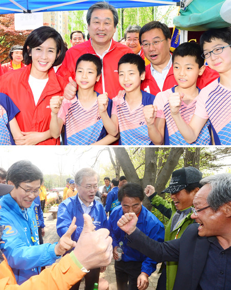 4.29 국회의원 보궐선거를 사흘 앞둔 26일 오전 경기 성남 중원에 출마한 새누리당 신상진 후보가 김무성 대표와 성남 실내체육관에서 유권자들을 만나 지지를 호소하고 있다. 새정치민주연합 문재인 대표도 인천서구 강화을에 출마한 신동근 후보와 함께 이날 오전 검단 5대향우회 합동 체육대회가 열린 인천 서구 백석초등학교를 찾아 지지를 호소하고 있다.