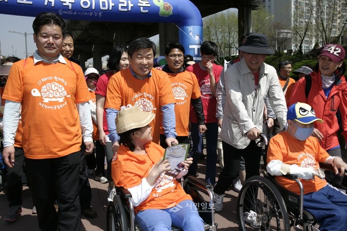 김경한 마포구 부구청장(왼쪽에서 두 번째)이 지난 25일 오후 서울 마포구 홍제천 수변무대에서 열린 '제6회 거북이 마라톤'에서 지역 장애인 및 주민들과 함께 출발선을 지나고 있다. (사진제공=마포구청)