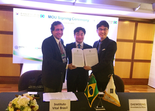 ㈜대웅제약(대표 이종욱)은 25일(현지시간 24일) 브라질 상파울루의 르네상스 호텔에서 브라질 국영제약 업체 비탈브라질(Vital Brazil)과 바이오의약품 기술 제휴협약(MOU)을 체결했다.
