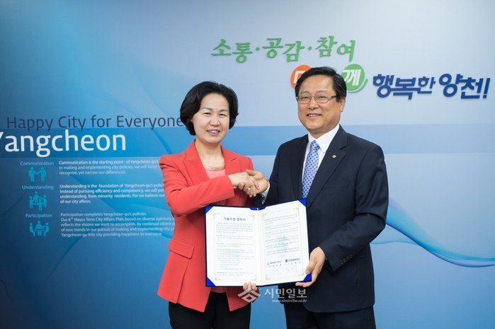 서울 양천구가 27일 국토교통부 산하 전문 공기업인 한국건설관리공사와 '기술지원 업무협약'을 맺었다. 사진은 이날 김수영 구청장(왼쪽)과 한국건설관리공사 관계자가 협약식에서 기념촬영한 모습. (사진제공=양천구청)