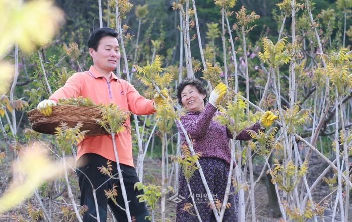 지리산 자락인 경남 함양군 마천면 의탄리 의중마을 장철안씨가 27일 오전 토종 참옻나무에서 옻순을 채취하고 있다. (사진=함양군청 김용만 주무관 제공)
