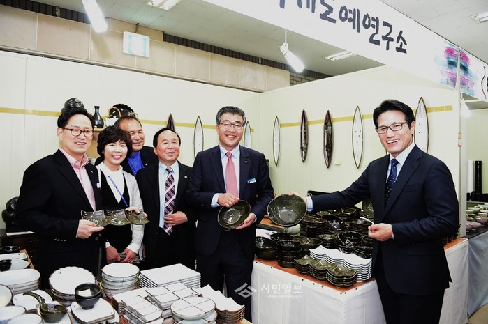 경기 여주시가 지난 25일 '도자천년 물결 따라 행복여행! 제27회 여주도자기축제'의 개막식을 진행했다. 사진은 이날 행사에 참여한 원경희 여주시장(오른쪽에서 두 번째), 정병국 국회의원(오른쪽)과 관계자들이 도자기를 들고 기념촬영한 모습. (사진제공=여주시청)
