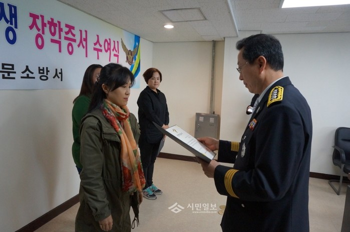최근 서울 서대문소방서는 소방서 강당에서 의용소방대원들이 참석한 가운데 '2015년도 우수 의용소방대 자녀 장학금' 증서 전달식을 개최했다. 사진은 장현태 소방서장이 장학증서를 전달하는 모습.