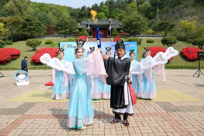 경기 안성시가 28일 안성시 3.1운동기념관에서 '제61회 경기도체육대회'의 성화 채화 행사를 진행했다. 사진은 이날 황은성 안성시장(오른쪽)이 성화를 들고 기념촬영한 모습. (사진제공=안성시청)