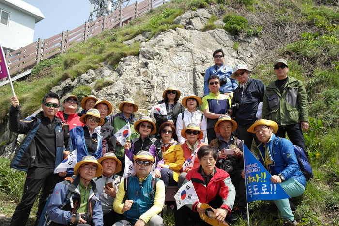 독도의용수비대기념사업회가 제2기 독도의용수비대 명예대원 독도탐방 행사를 최근 진행했다. 사진은 제2기 독도의용수비대 명예대원들이 독도 한국령 암각서 앞에서 기념촬영을 하고 있는 모습. (사진제공=독도의용수비대기념사업회)/뉴시스