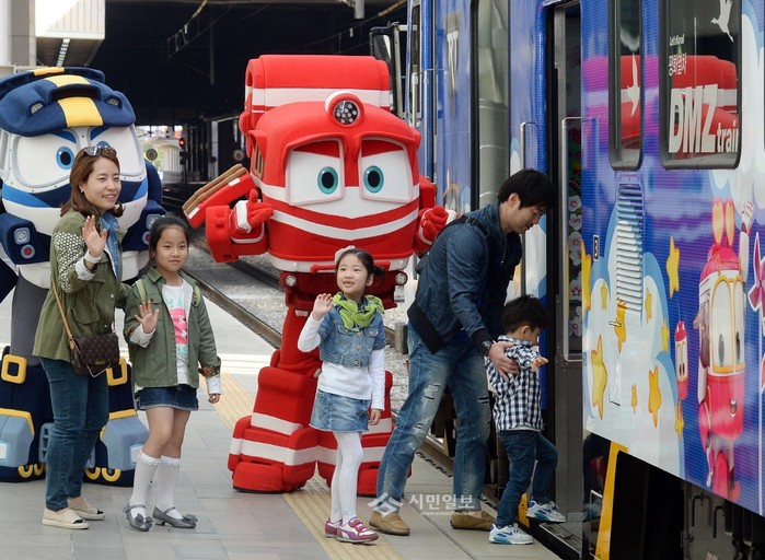 CJ E&M과 코레일이 오는 5월 가정의 달을 맞아 선보인 '로봇트레인과 함께하는 DMZ 기차여행'에 참가한 가족들이 28일 오전 서울 용산구 서울역 승강장에서 애니메이션 '로봇트레인' 캐릭터 기차에 탑승하고 있다. /뉴시스
