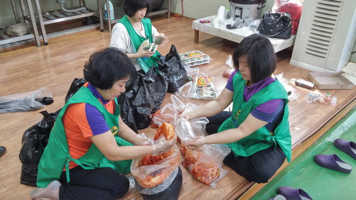 경기 동두천시 불현동 새마을부녀회가 지난 27일 지역내 어려운 이웃을 위한 사랑의 밑반찬 나눔 봉사를 실시했다. 사진은 이날 부녀회원들이 이웃들과 나눌 김치를 담고 있는 모습. (사진제공=동두천시청)