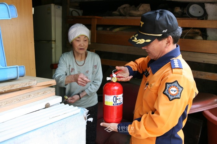 강남소방서가 지난 28일 달터마을에서 포스메이트, 밀알복지재단과 함께 주택화재 예방을 위한 기초소방시설 보급 및 소화기 보관함을 설치했다. 사진은 이날 한 소방대원이 주민에게 소화기 사용법을 설명하고 있는 모습. (사진제공=강남소방서)