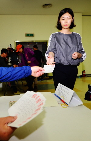 29일 오전 광주 서구 금호2동 제5투표소 서구문화센터 1층 전시실에서 유권자들이 4.29재보궐선거 광주 서구을 지역 투표를 행사하고 있다. /뉴시스