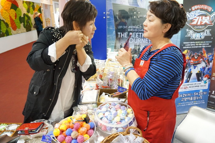 '2015 고양국제꽃박람회'에서 지난 28일 고양시 브랜드 관광 상품관 'I LOVE GOYANG GIFT SHOP'이 운영됐다. 사진은 고양시 브랜드 관광 상품관에서 장미꽃 귀걸이를 착용해보는 방문객의 모습. (사진제공=고양시청)