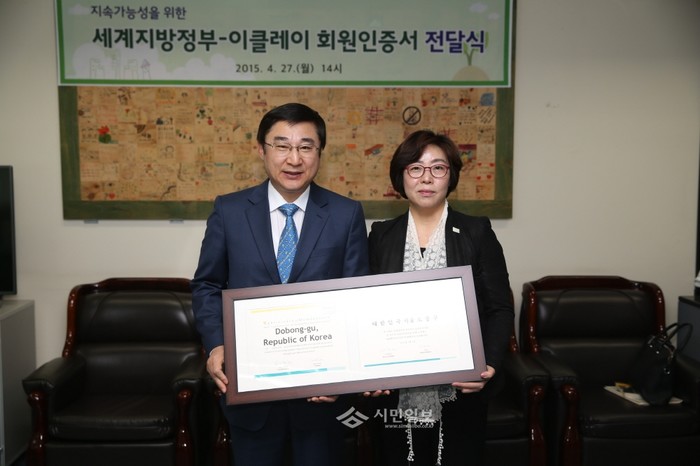 지난 27일 이동진 서울 도봉구청장(왼쪽)이 구청장실에서 열린 '지속가능성을 위한 세계지방정부-이클레이(약칭 이클레이)' 회원 인증서 전달식에서 박연희 이클레이 한국사무소 소장으로부터 회원 인증서를 전달받고 기념촬영을 하고 있다. 도봉구는 지난 3일자로 이클레이에 공식가입했다. (사진제공=도봉구청)