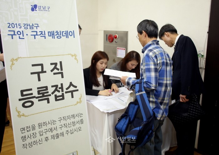 지난 28일 서울 강남구청에서 구인·구직난 해소를 위해 열린 구직자와 중소기업의 만남을 주선하는 ‘구인·구직 매칭데이’에 참가한 구직자들이 참가 신청서를 제출하고 있다. (사진제공=강남구청)