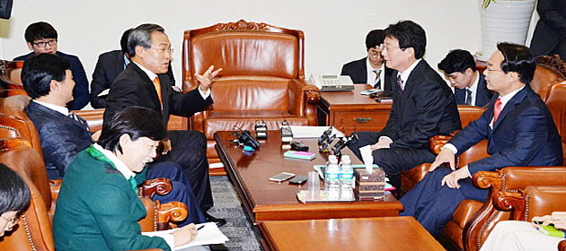 새누리당 유승민·새정치민주연합 우윤근 원내대표등 지도부가 29일 오전 서울 여의도 국회 운영위원장실에서 주례회동을 갖고 인사하고 있다.