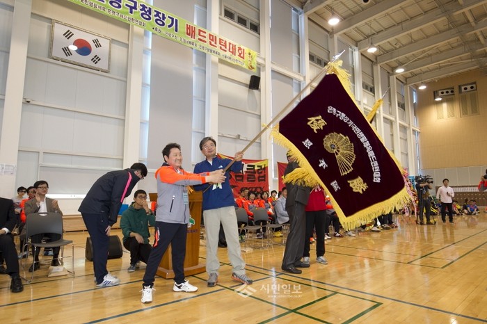 '제26회 은평구청장기 생활체육 배드민턴대회'가 지난달 25~26일 양일간 은평다목적체육관에서 열렸다. 사진은 김우영 은평구청장(오른쪽)과 은평구 관계자들이 배드민턴 대회에서 깃발을 흔들고 있는 모습.(사진제공=은평구청)